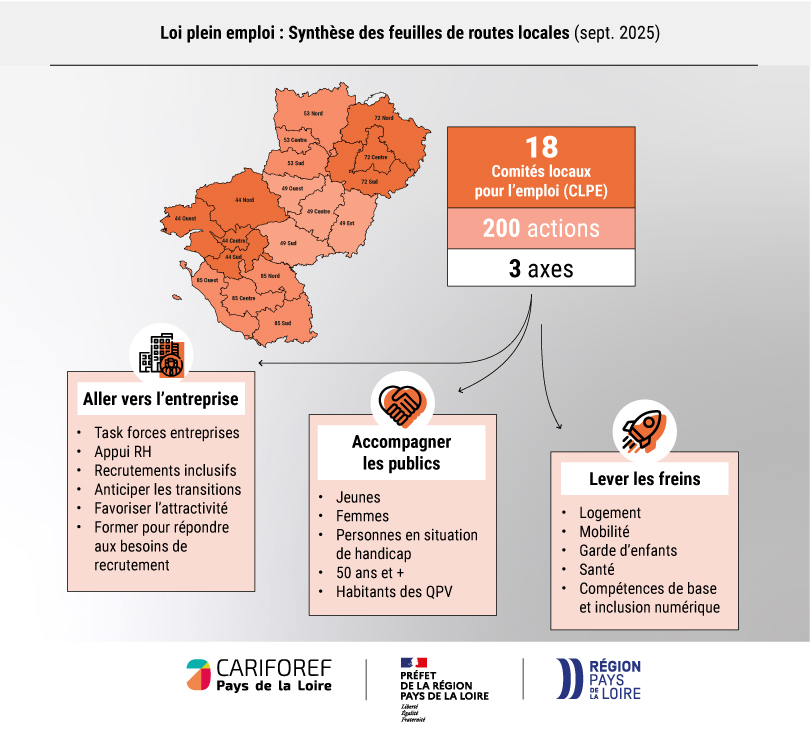 En Pays de la Loire, les 18 Comités locaux pour l’emploi (CLPE) déclinent la loi pour le plein emploi au plus près des réalités territoriales. Plus de 200 actions ont déjà été engagées pour répondre aux besoins des entreprises, accompagner les publics et lever les freins périphériques à l’emploi.