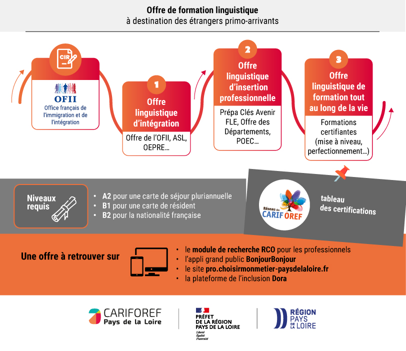 En lien avec le Réseau des Carif-Oref et la Dian, le Cariforef des Pays de la Loire contribue à recenser l’offre de formation linguistique en région et à professionnaliser les acteurs œuvrant autour de l’intégration et de l’insertion professionnelle des primo-arrivants et des réfugiés.