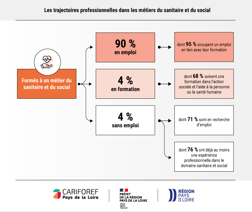Depuis plus de quinze ans, à la demande de la Région, le Cariforef des Pays de la Loire analyse chaque année l’insertion professionnelle des personnes sorties de formations sanitaires et sociales. L’enquête 2025 porte sur les personnes formées entre 2020 et 2024 et s’intéresse à leur situation professionnelle un à cinq ans après leur sortie de formation.
