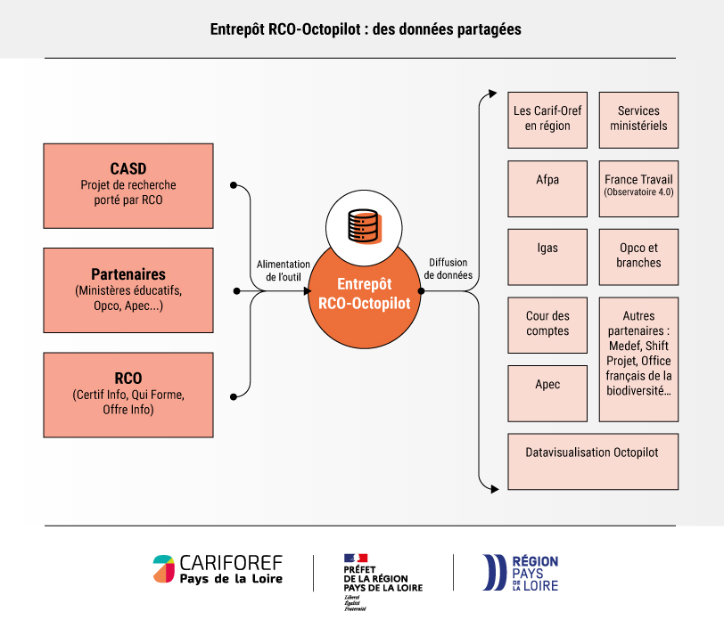 Pour construire cet entrepôt de données, baptisé l’entrepôt RCO-Octopilot, le RCO a engagé un travail de collecte en nouant des partenariats avec les principaux acteurs nationaux : France Travail, les Opérateurs de compétences (Opco), France compétences, l’Insee, la Dares et plusieurs ministères (Education nationale, Enseignement supérieur et Recherche, Agriculture…), etc.